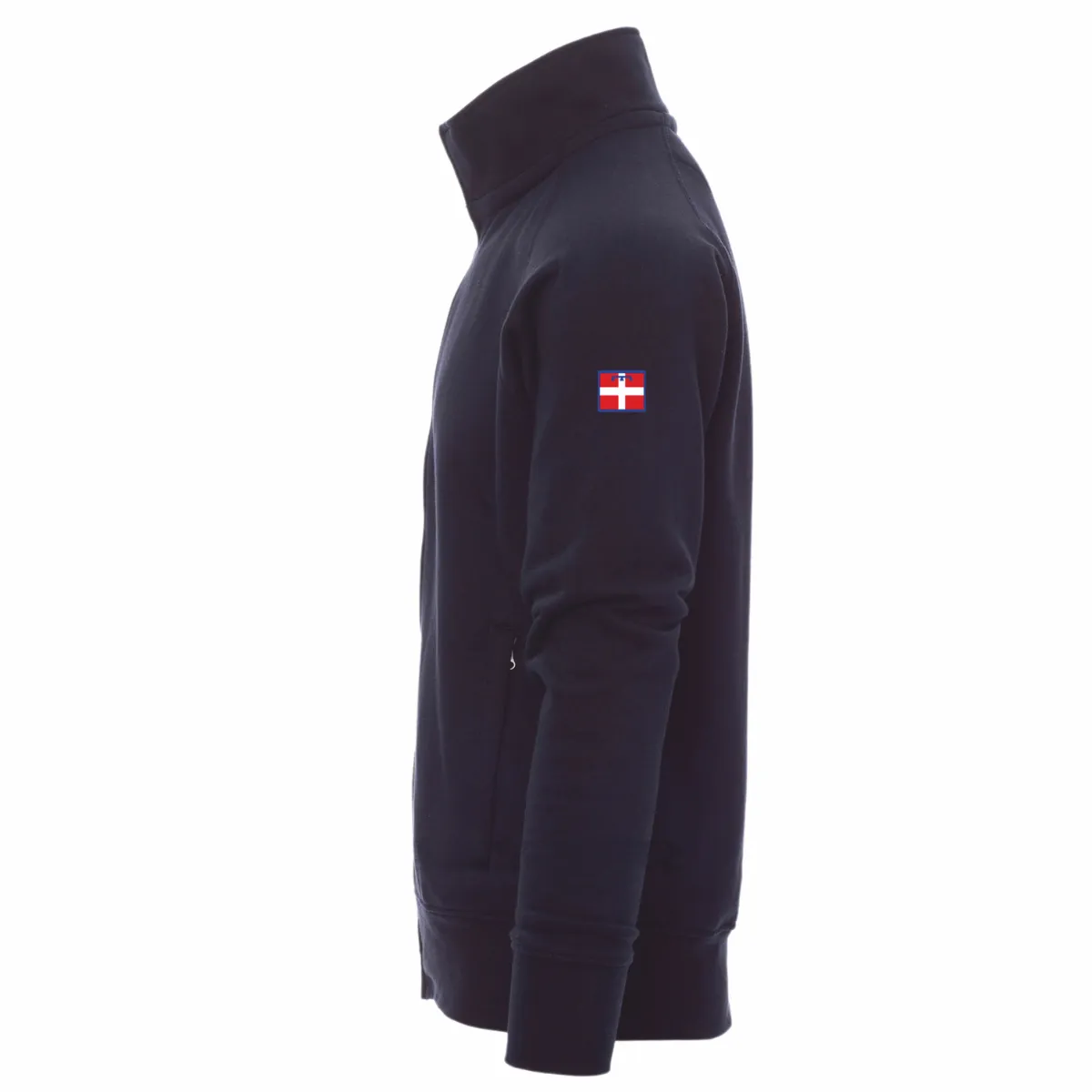 Felpa da uomo, zip intera SBS coperta, in plastica con doppio cursore in metallo, manica raglan, due tasche con zip coperte, polsini e vita in costina elasticizzata, cuciture rinforzate.