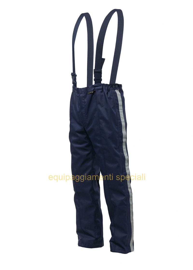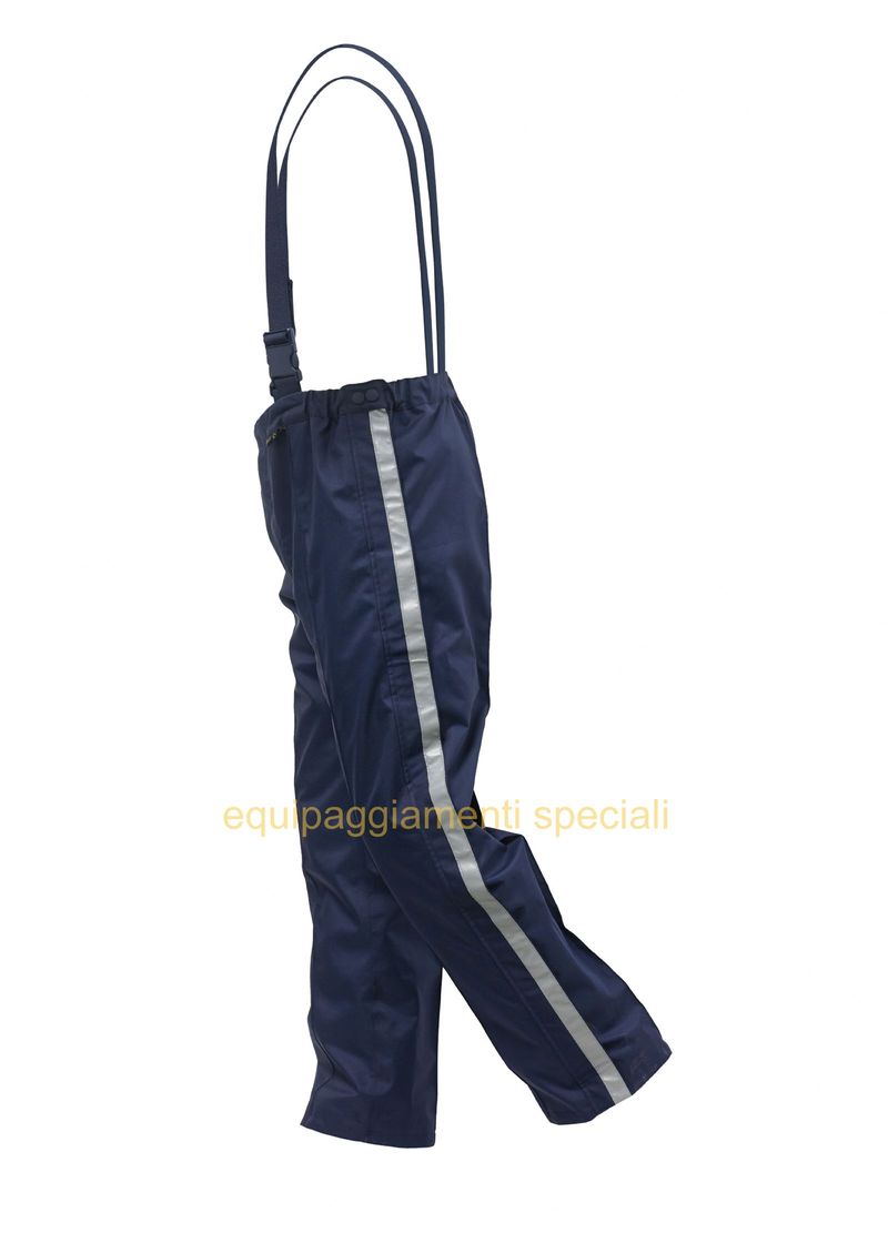 Copripantalone impermeabile/traspirante - Elastico sul giro vita - Zip sul davanti coperta da pattina - Cuciture termonastrate - apertura ai lati con cerniera su tutta la lunghezza coperta da patta fermata da bottoni a pressione in vita e nastro velcro su 5 punti - Bretelle elasticizzate regolabili applicate - Banda retroriflettente su tutta la lunghezza gambe. Cert. UNI EN 343 cl.3:3 UNI EN ISO 13688
