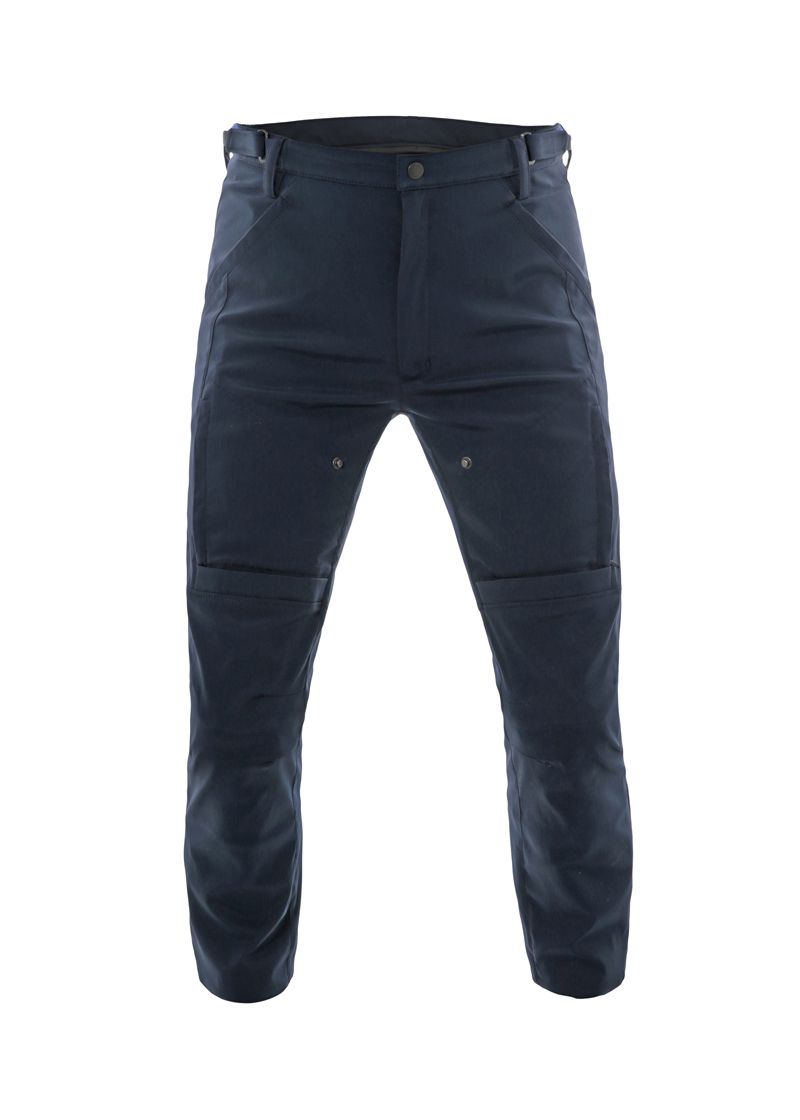 Pantalone estivo DAINESE® da motociclista in tessuto elasticizzato di colore blu. Apertura di ventilazione sulla coscia. Completo di protezioni fianchi, ginocchia e tibia. DPI di II categoria, classe C.