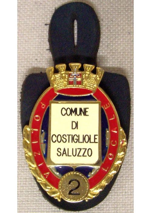 Placca pettorale Reg. Piemonte POLIZA LOCALE in ottone personalizzata con denominazione del comune incisa completa di numero matricola e supporto in cuoio