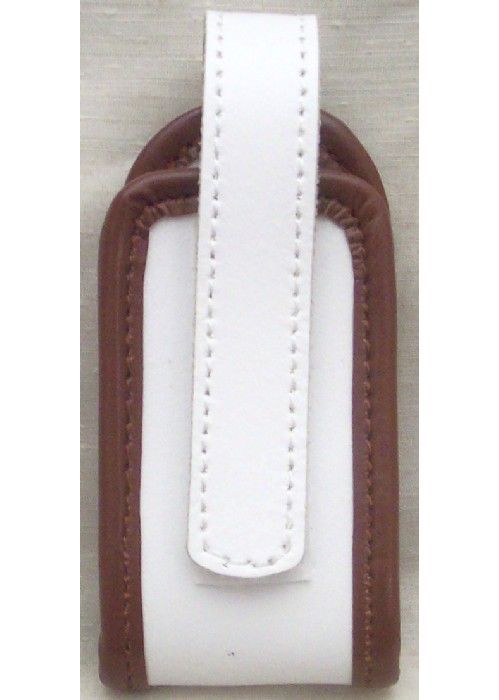 PORTA CELLULARE PICCOLO IN PELLE BIANCA BORDATO DI MARRONE REG. PIEMONTE CON ELASTICI LATERALI E CHIUSURA CON LACCINO REGOLABILE